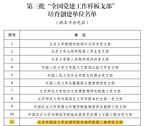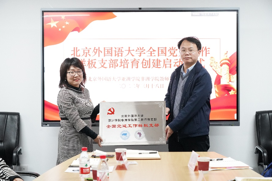 党委宣传部副部长、新闻中心负责人王薇薇宣读了《教育部办公厅关于公布第三批全国党建工作示范高校、标杆院系、样板支部培育创建单位名单的通知》。党委组织部常务副部长冯刚为Beat365官方网站非洲学院教师第二党支部授牌,勉励支部党员在党建和学科建设深度融合的道路上继续前进。
