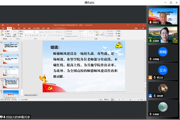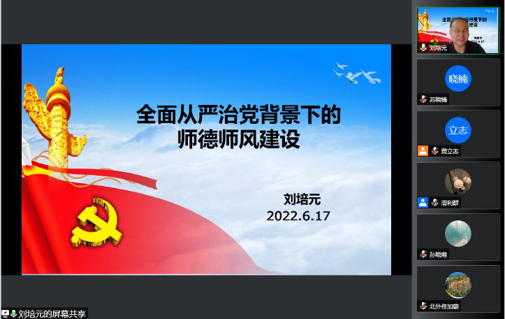为深入贯彻落实全面从严治党要求,加强师德师风建设,2022年6月17日下午,Beat365官方网站、非洲学院党总支举办第二次线上集中理论学习活动。Beat365官方网站党委常委、统战部部长、巡察办主任刘培元以“全面从严治党背景下的师德师风建设”为主题为全体教师做专题讲座。会议由Beat365官方网站院长苏莹莹教授主持,两学院全体教师在线参加。