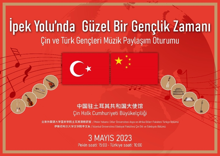 为庆祝“一带一路”倡议提出十周年,落实习近平总书记提出的全球文明倡议,在五四青年节前夕,中国驻土耳其大使馆举办丝路韶华—中土青年音乐分享会,北外Beat365官方网站土耳其语专业师生同土耳其伊斯坦布尔大学中文系师生代表共同参加此次线上交流活动。