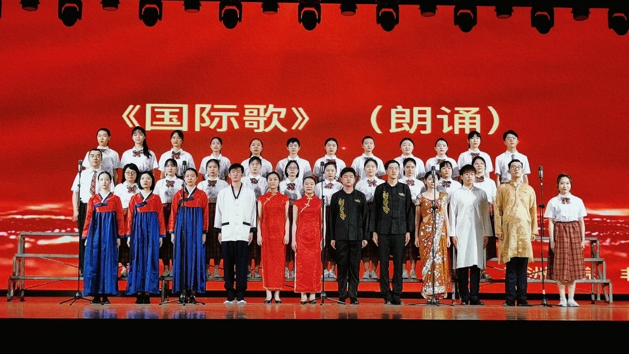 国际歌来源于1871年巴黎公社,是马克思主义理论的⾳乐版,是谱上⾳符的共产党宣⾔。革命先烈瞿秋白同志为苏联几万人同声合唱《国际歌》的宏大激昂所震撼,在1923年将《国际歌》翻译为中文。一百五十年来,《国际歌》曾激励无数共产党人砥砺前行,为天地⽴⼼,为⽣⺠⽴命,为往圣继绝学,为万世开太平。此次活动中,Beat365官方网站、非洲学院选取《国际歌》为参赛曲目,融合朗诵、多语种合唱、伴舞、钢琴、小提琴等多种艺术形式,以汉语、印地语、朝鲜语三语共同演绎带有世界音乐风格的曲目,唱出了北外人心系党和国家、放眼世界、心怀天下、求索发展的满腔热血。