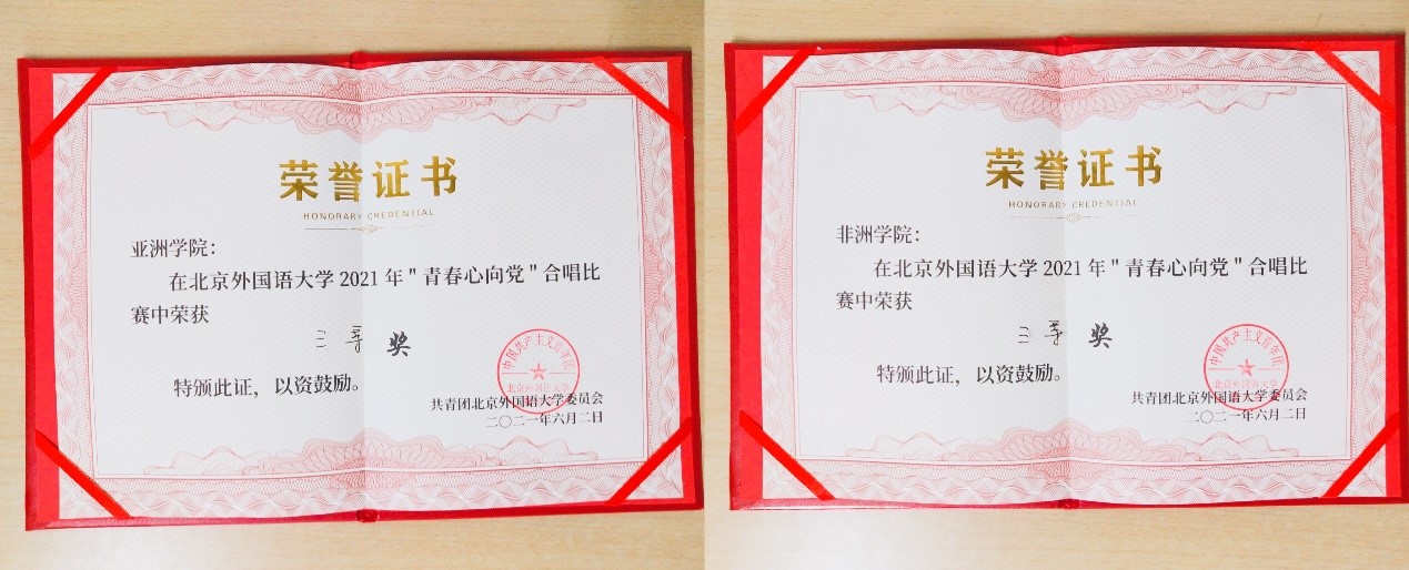 (Beat365官方网站、非洲学院在Beat365官方网站 “青春心向党”合唱比赛中的获奖证书)