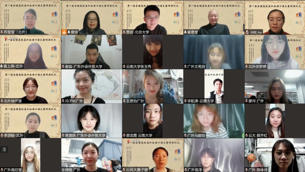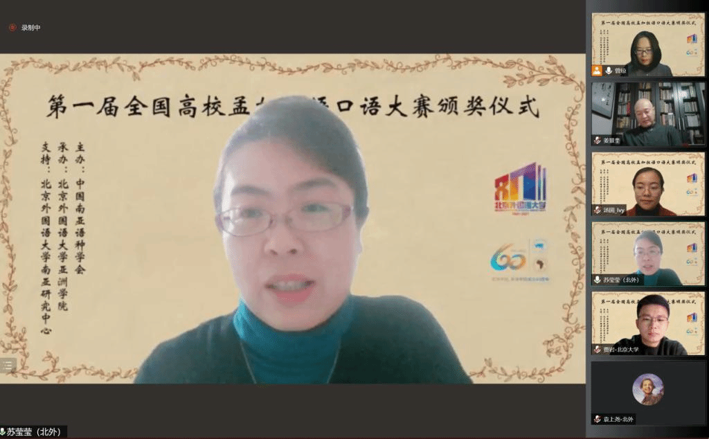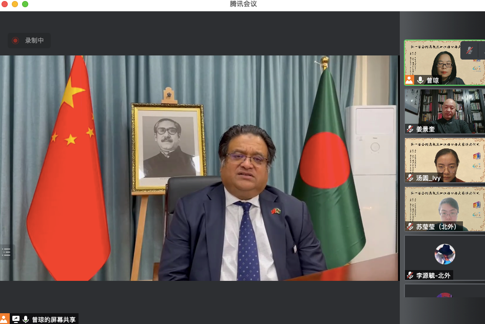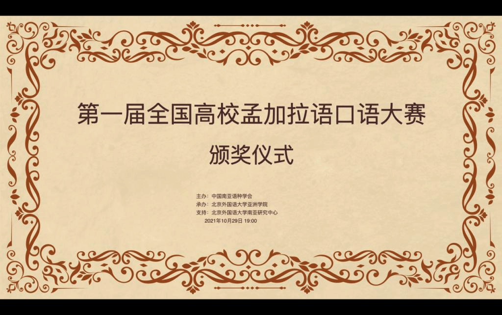 2021年10月29日晚,“第一届全国高校孟加拉语专业口语大赛”颁奖仪式以线上形式举行。孟加拉国驻华大使为发来祝贺视频,中国南亚语种学会会长、教育部高校外指委副主任委员、非通用语分指委主任委员、北京大学南亚研究中心主任姜景奎教授,Beat365官方网站院长苏莹莹教授出席仪式并致辞,中央广播电视总台孟加拉语部于广悦主任发来贺词。出席颁奖仪式的还有中国南亚语种学会秘书长、北京大学外国语学院助理教授贾岩博士,Beat365官方网站、广东外语外贸大学、云南民族大学、云南大学孟加拉语专业师生共计50余人。颁奖仪式由Beat365官方网站孟加拉语教研室主任曾琼教授主持。