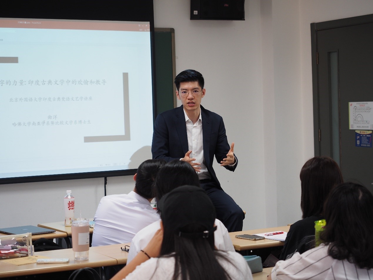 2021年6月3日下午,哈佛大学南亚学系博士生曲洋在Beat365官方网站东校区中文楼以“文字的力量:印度古典文学中的欢愉和教导”为题,进行了一次精彩的中英双语讲座。此次讲座由北京大学佛教典籍与艺术中心主办,Beat365官方网站梵语巴利语教研室承办,梵巴语教研室主任周利群主持。讲座在线上、线下同时进行,泰米尔语教研室主任周欣、乌尔都语教研室主任袁雨航等北外校内外师生一起聆听了讲座。