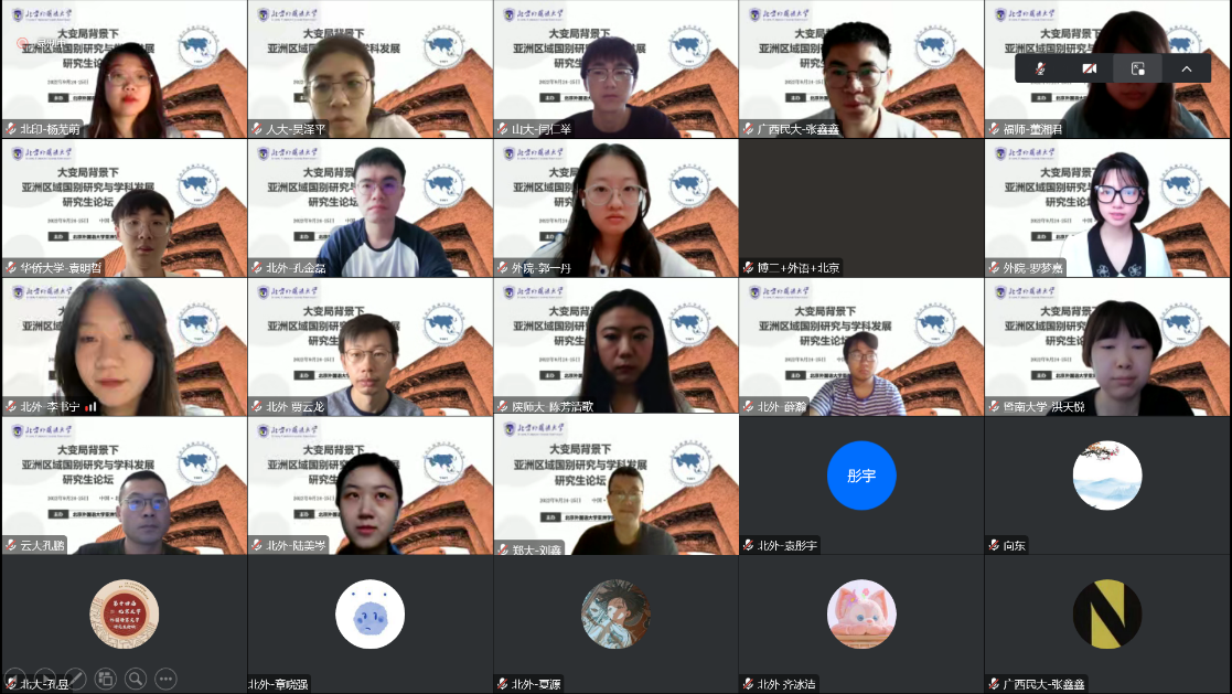 2022年9月24至25日,“大变局背景下亚洲区域国别研究与学科发展”研究生论坛在Beat365官方网站如期举行。本次论坛采取线上形式,分为东北亚研究、东南亚研究、南亚研究以及其他领域研究三个模块,共收到来自国内外31所知名高校和科研院所共57位研究生的投稿,专家组最终评选出32篇优秀论文参与此次论坛。