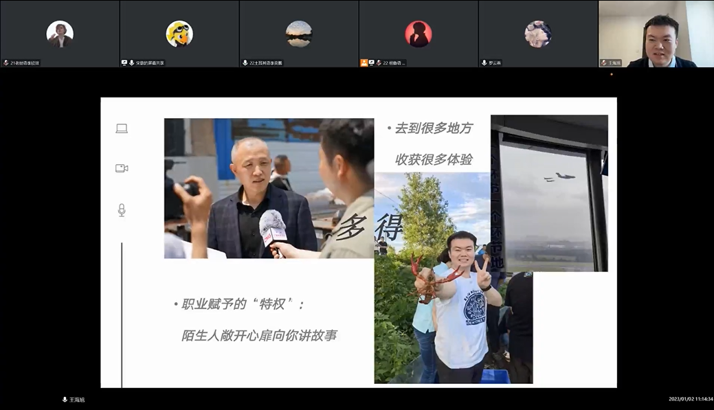 之后由王海旭进行分享,王海旭现就职于中央广播电视总台亚洲非洲地区语言节目中心。他从“是什么”、“做什么”、“怎么样”、“怎么进”四个方面介绍了中央广播电视总台的组织架构及自身工作内容。他还分享了工作期间的轶事,他说:“工作过程有趣,即便做的都是小事情,也很有成就感。”最后,他介绍了中央广播电视总台的招聘时间线并给出了备考建议。