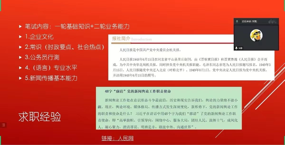 随后由宋歌进行分享,宋歌现就职于人民网海外传播部。她从语种内部和部门协作两方面介绍自己的工作内容,语种内部包括内容建设和平台建设两大部分,内容建设包括新闻编译、采编报道等,平台建设下设PC网页、新媒体平台等模块。部门协作主要涉及各部门为完成同一项工作所进行的交流合作。最后,宋歌分享了入职人民网的亲身经验和备考建议。