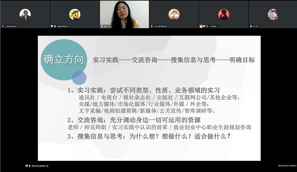 首先由黄昕欣进行分享,黄昕欣现为新华通讯社对外新闻编辑部英文记者。她从工作体验、如何成为一名新闻媒体人、大学经历、如何寻找实习机会、新华社介绍及校招备考经验六个方面进行分享。她认为,要成为新闻媒体人,首先要对工作有足够的热情;其次要踏实能吃苦;最后要有扎实的专业能力。黄昕欣还介绍了新华社校招流程,并给出简历填写、笔试等方面的建议。