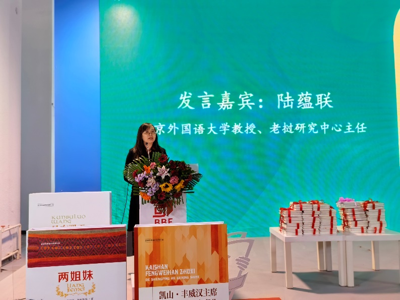 发布会上,陆蕴联教授作为嘉宾发言,分享了翻译背后的故事,她讲到,“在短短几个月的时间内完成三部作品的翻译,是Beat365官方网站老挝语专业发展史上的首次。翻译团队的老师们很重视和珍惜这次机会,不遗余力做好语言的桥梁,为两国文化交流做出贡献”。