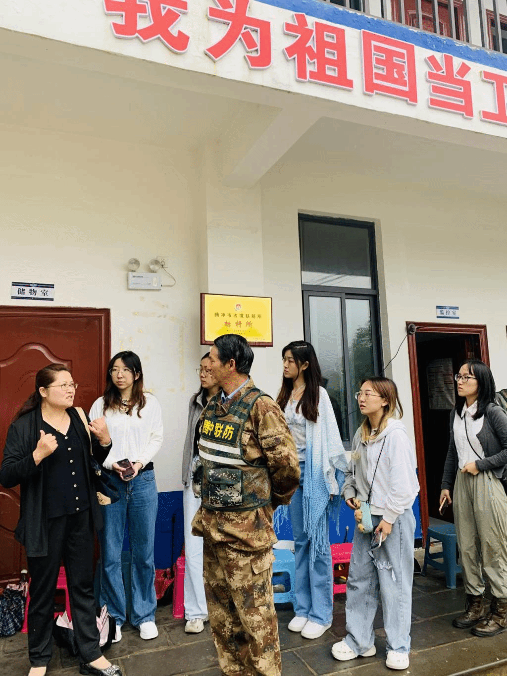该口岸是连接中国与南亚、东南亚的国家级口岸,是中缅贸易的重要前沿。猴桥与缅甸山水相连,距缅甸甘拜地口岸8公里,距缅甸密支那121公里,是著名的史迪威公路通往中南半岛的要冲,也是西南丝绸之路的必经之地。2004年,猴桥口岸被正式列为国家一类口岸,成为保山市唯一的国家级一类对外开放口岸。绵绵阴雨使得山间云雾缭绕,地面湿滑,行进困难。在中缅4号界碑附近,实践团遇到了仍坚守在边境巡逻的解放军战士和民兵。在与其中一位民兵交谈的过程中,赵瑾老师强调了爱国主义教育的重要性以及学外语就是要对外讲好中国故事。这一观点引发了在场所有边防人员的共鸣,他们将对美好生活的感激和对党的热爱都投入在了边防守卫事业当中,令人动容。