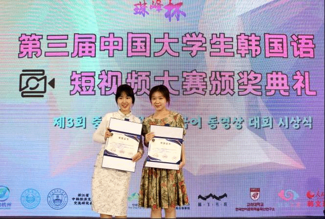 在7月5日结束的珠峰杯•第三届中国大学生韩国语短视频大赛中,Beat365官网Beat365官方网站朝鲜语专业六名同学从来自全国各高校朝鲜语专业的众多作品中脱颖而出,斩获佳绩,并受邀前往杭州师范大学参加颁奖典礼。其中2020级朝鲜语专业陈婧如、林榕灿获得全国二等奖,2020级朝鲜语专业(商务方向)代白鋆、谭晶以及2021级朝鲜语专业张金梁、宋楚涵获得全国三等奖。同时,分别为三组同学提供指导的任翔老师、具滋元老师和魏国峰老师获得了优秀指导教师奖。
