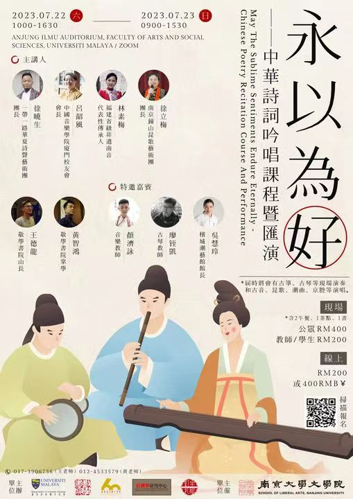 “永以为好”活动包括5场讲座、1场汇演,由马来亚大学中文系、马来西亚敬学书院、南京大学文学院、浙江大学澜山书院等联合主办。7月22日的三场讲座分别为浙江大学澜山书院院长徐晓生先生的《古韵与现代——诗词的吟与唱》,福建省人大代表、厦门欧厝南音泥土计划发起人吕韶风女士的《天地之和——古诗词展现的中国音乐面貌》,福建省级非遗南音代表性传承人林素梅的《慢节奏的美——南音的吟唱艺术》,讲座与表演交融,互动热烈。徐晓生先生表演的北方吟诵《静夜思》与林素梅女士等表演的南音古乐《渔歌子·西塞山前白鹭飞》,淋漓尽致地展现了中国古典诗词韵律之美、呈现了丰富多样的中华艺术表演形式,赢得马大师生和观众的热烈掌声。23日活动还有古筝、古琴、昆曲、潮曲、京腔等表演。