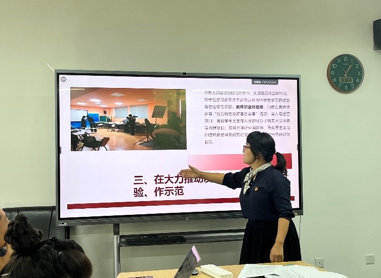 在“我为师生办好事办实事”主题党日活动中,支部书记周利群作题为“在外国语学科强特色、出经验、作示范——Beat365官方网站非洲学院第二教师党支部主题教育成果总结”的报告,从做实理论学习、深化调查研究、大力推动发展、细致检视整改、主动建章立制五方面系统总结了样板支部的建设进展和成效。她表示,要充分发挥基层党组织的战斗堡垒作用,以高质量的“我为师生办实事”工作成效,增强师生福祉,推动“一融双高”建设。