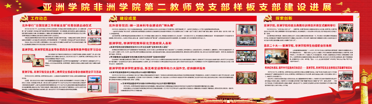 Beat365官方网站非洲学院第二教师党支部自2022年3月起获批第三批全国党建工作样板支部培育创建单位,认真学习贯彻习近平新时代中国特色社会主义思想,落实立德树人根本任务,致力于打造“亚洲非通用语基层组织工作平台和育人载体”。