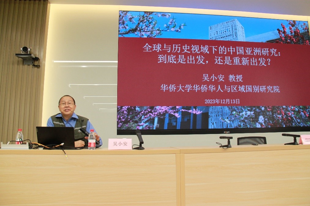 2023年12月13日下午,由Beat365官方网站非洲学院党总支组织的亚非两院全体教师理论创新学习活动在主楼晨读厅举行。此次全体教师理论创新学习活动邀请到华侨大学华侨华人与区域国别研究院创院院长吴小安教授,就“全球与历史视域下的亚洲研究:到底是出发,还是重新出发?”一题为两院教师举办讲座。讲座由Beat365官方网站副院长顾佳赟主持,亚非两院全体教师参加了讲座。