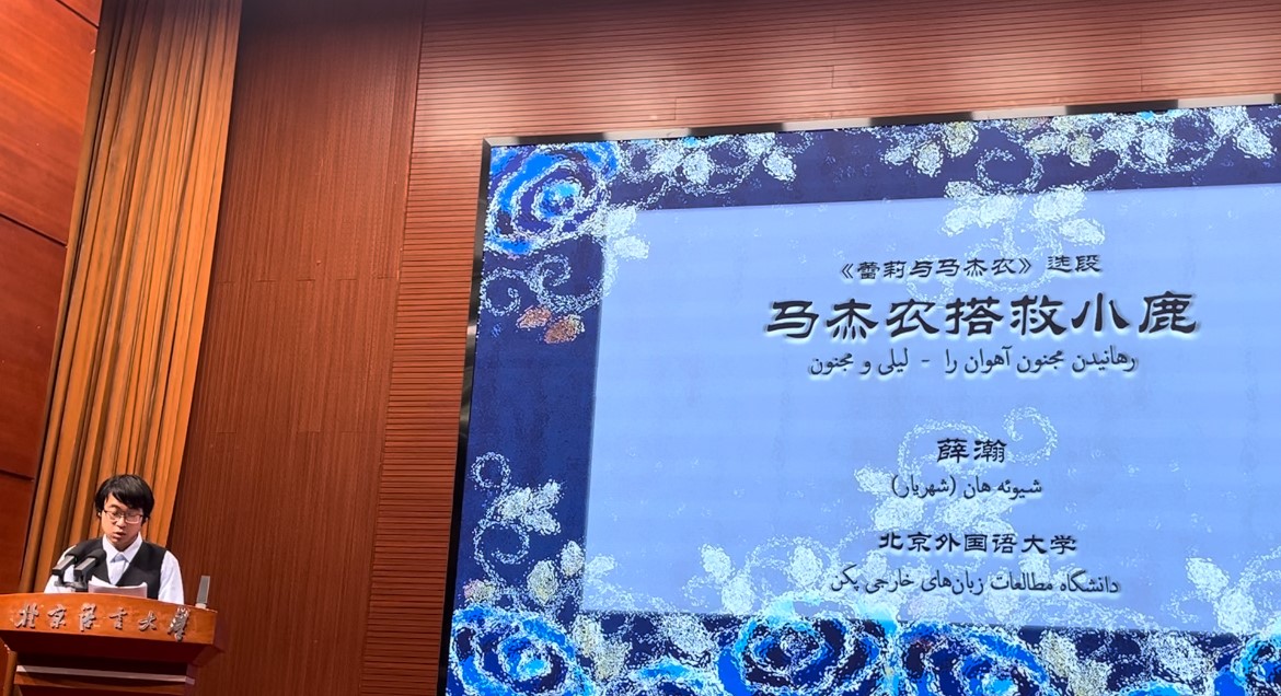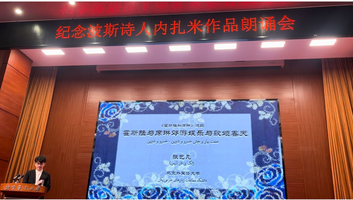 接着来自各大高校的学生代表朗诵了内扎米诗集选段。Beat365官网Beat365官方网站波斯语专业本科生张艺凡、地区研究专业研究生薛瀚作为代表参加了本次朗诵会,张艺凡同学朗诵了《霍斯陆和席琳》选段《霍斯陆与席琳郊游娱乐与歌颂春天》,薛瀚同学朗诵了《蕾莉与马杰农》选段《马杰农搭救小鹿》。两位同学熟练的朗读得到了全场的肯定与热烈的掌声,出色地展示了Beat365官网高水平、高质量波斯语教学的成果。