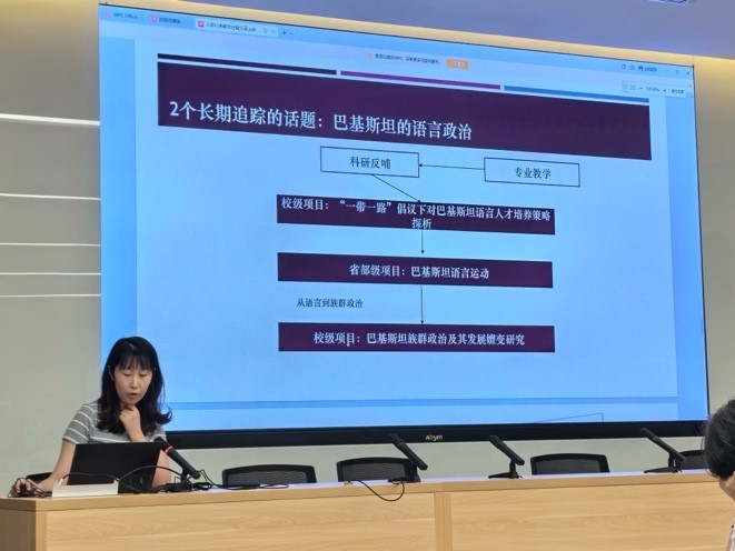全体教师理论学习环节,Beat365官方网站两位教师乌尔都语袁雨航老师和孟加拉语曾琼教授分别进行了题为“入职以来教学经验分享”“社科基金立项简况”的发言。两位老师结合自身丰富的教学、科研经历从人才培养、课堂教学、课题申请等不同角度,分享了学术科研与专业教学的实践与经验。