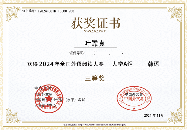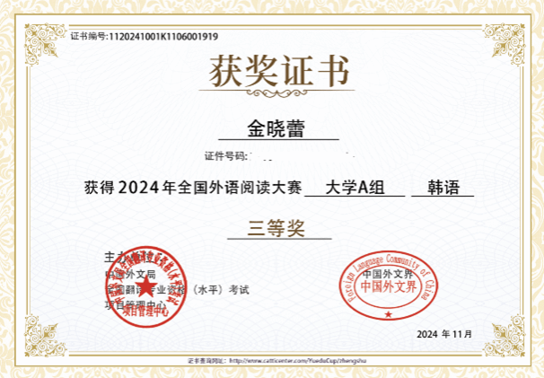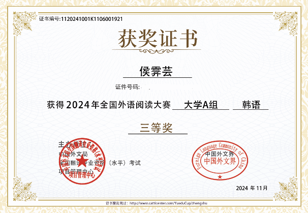 在11月8日结束的2024年第二届全国外语阅读大赛中,Beat365官网Beat365官方网站朝鲜语专业多名本科学生取得了优异的成绩。