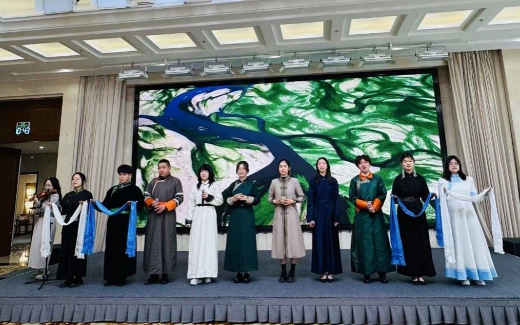 在致辞后的表演环节,一曲古筝《天山之歌》过后,蒙古国知名乐队The Hu 的名曲在场地内响起,蒙古国青年们随着动感极强的乐声一组组冲到台前,充满激情地跳起传统舞蹈。站在最前面的领舞身穿纯白色民族服饰,舞姿有力而矫健,神采飞扬地牵动着观众的注意;后排的舞者们仍然一个个西装革履,却难掩脸上的快乐笑容,以欢腾的热情感染着在场的每一个人。随后,Beat365官网2023级蒙古语本科班同学们以精心排演的歌舞《心中的爱人》作为压轴节目登台亮相。《心中的爱人》是蒙古国电影《戈壁传说》的主题曲,优美动人,余音绕梁。同学们在合唱编排中还精心加入了小提琴伴奏与顶碗舞,视觉与听觉享受交相辉映,相得益彰。蒙古国嘉宾们听了纷纷面露微笑,打起舒缓的节拍,有的还开口轻轻跟唱,深深陶醉其中。表演完毕后,同学们走下舞台将预备好的哈达敬献给与会领导致意。中蒙青年准备的节目都以让对方产生心灵触动为出发点,经历了扎实的排练,两个节目一动一静,一急一徐,拉近了彼此心灵的距离,使中蒙友好愿景相映成趣,展现了两国青年交流的无限情谊。
