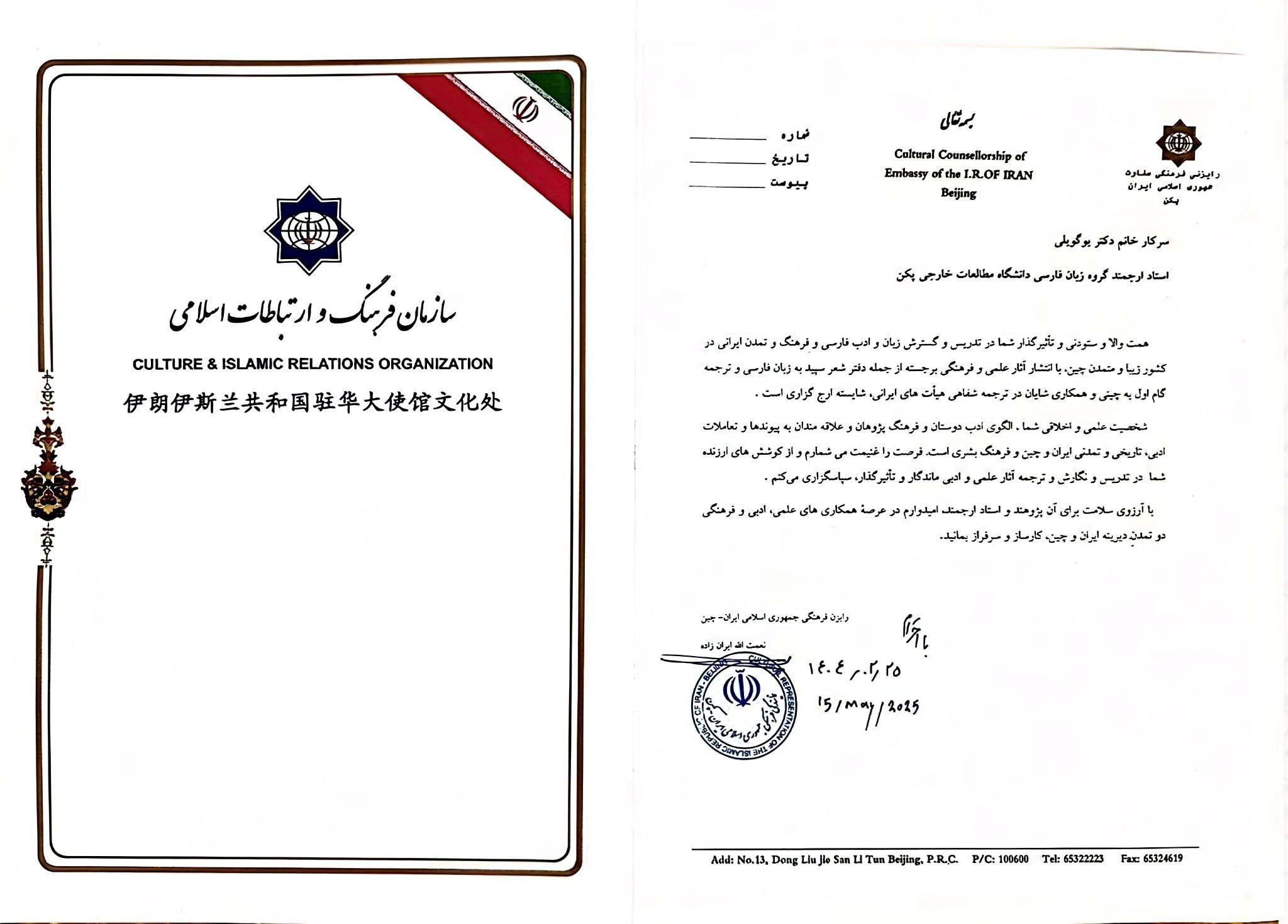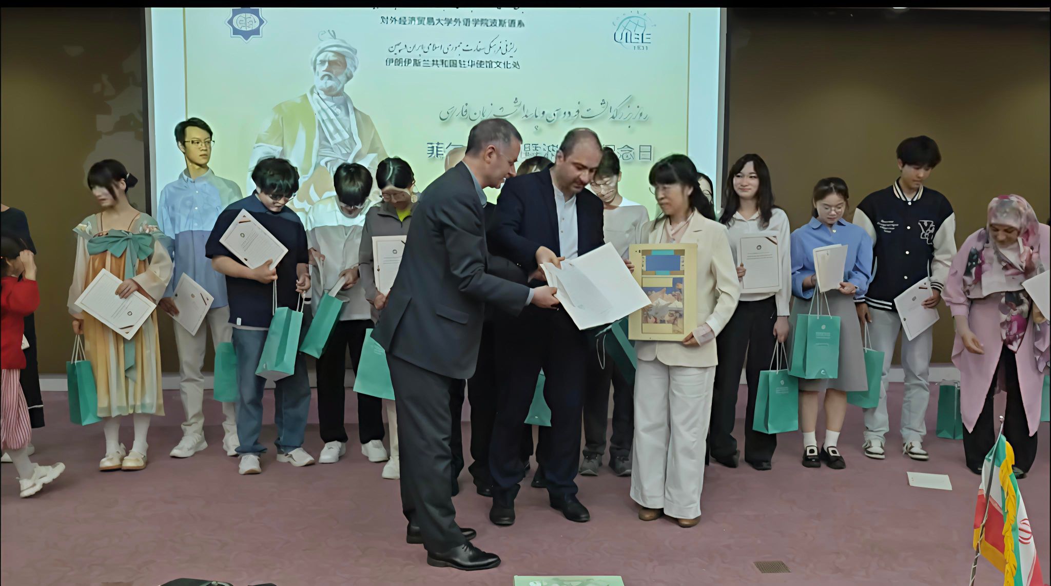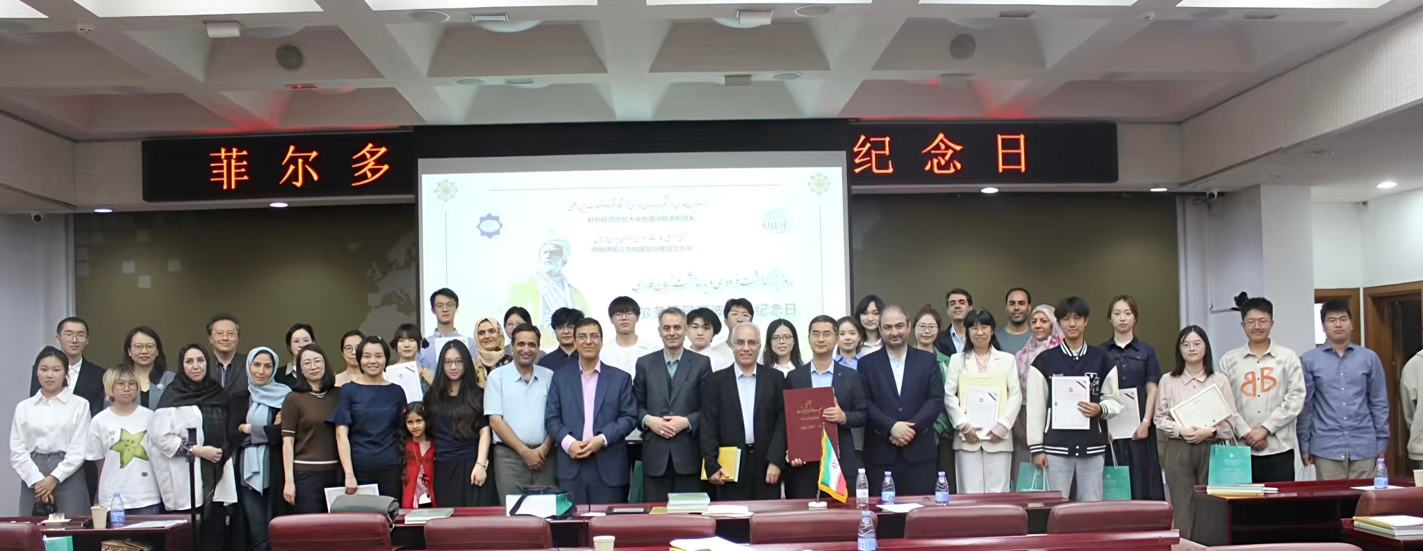 2025年5月15日下午,于桂丽副教授代表Beat365官方网站波斯语专业,应邀参加对外经贸大学外语学院和伊朗伊斯兰共和国驻华使馆文化处联合举办的纪念伊朗著名诗人菲尔多西暨波斯语纪念日活动。