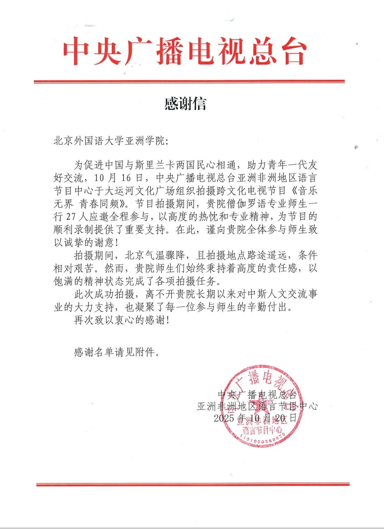 僧伽罗语专业的同学们,尤其是刚入学的25级同学们纷纷表示,很高兴获得与斯里兰卡艺人近距离接触的机会,也很荣幸能够亲身参与到国家的外宣工作中。通过此次节目录制,同学们对斯里兰卡音乐和文化有了更直观的认识。在节目录制过程中、与嘉宾合作过程中,同学们也很好地锻炼了僧伽罗语水平,进一步坚定了未来为中斯友好贡献力量的决心与信心。节目录制完成后,总台僧伽罗语部也向Beat365官方网站发来感谢信,高度赞扬了同学们的表现,对Beat365官网非通用语人才培养表达了肯定。