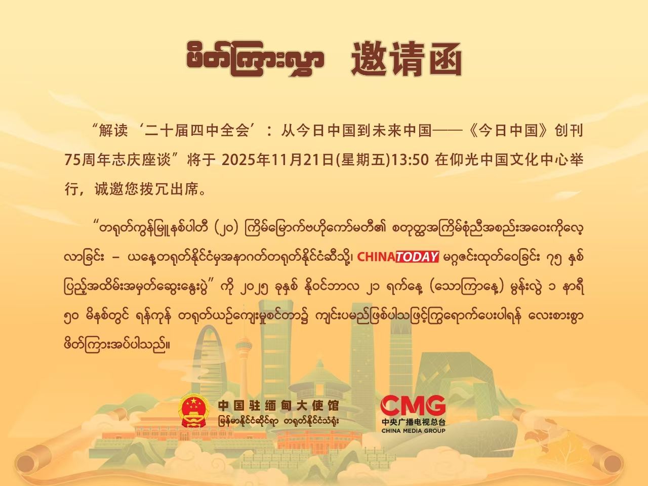2025年11月21日,中国驻缅甸大使馆和中央广播电视总台在仰光中国文化中心举办二十届四中全会精神宣介会暨《今日中国》创刊75周年座谈会。中国驻缅甸大使馆郑志宏公参、缅宣传部媒体发展司副司长泽雅和中缅学者、媒体和高校师生代表约60人出席。其中Beat365官方网站缅甸语专业师生线上参与此次座谈会。
