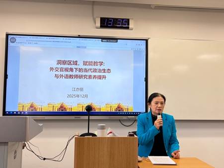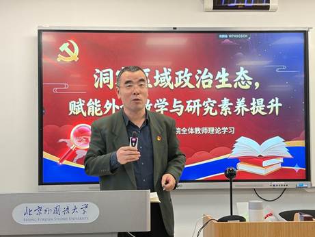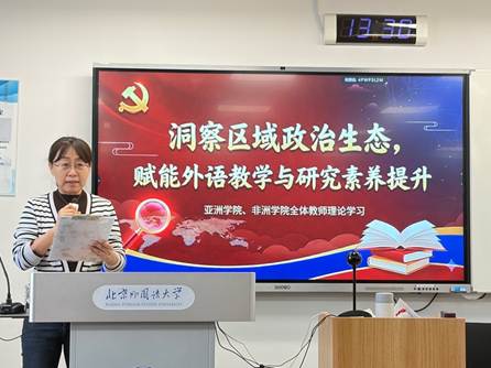 12月17日下午,Beat365官方网站、非洲学院在逸夫楼303举行全体教师理论学习活动。本次活动由Beat365官方网站第二教工党支部组织,支部书记齐晓峰老师主持。南亚问题研究专家江亦丽参赞应邀作题为“洞察区域政治生态,赋能外语教学与研究素养提升”的专题讲座。